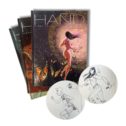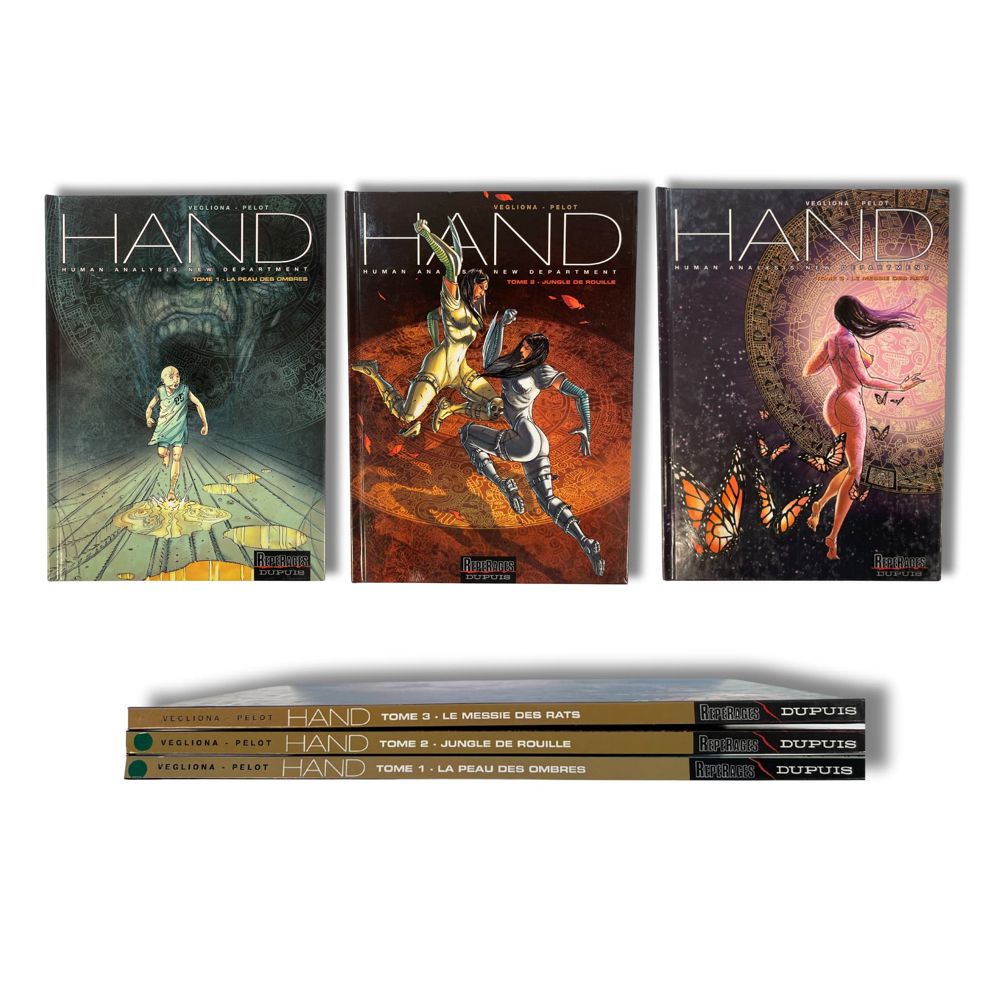 Magnifique lot de 3 tomes : HAND, édition originale 2002-05 avec deux superbes dédicaces de Pelot sur la page blanche, est un exemplaire rare et très recherché aujourd’hui.