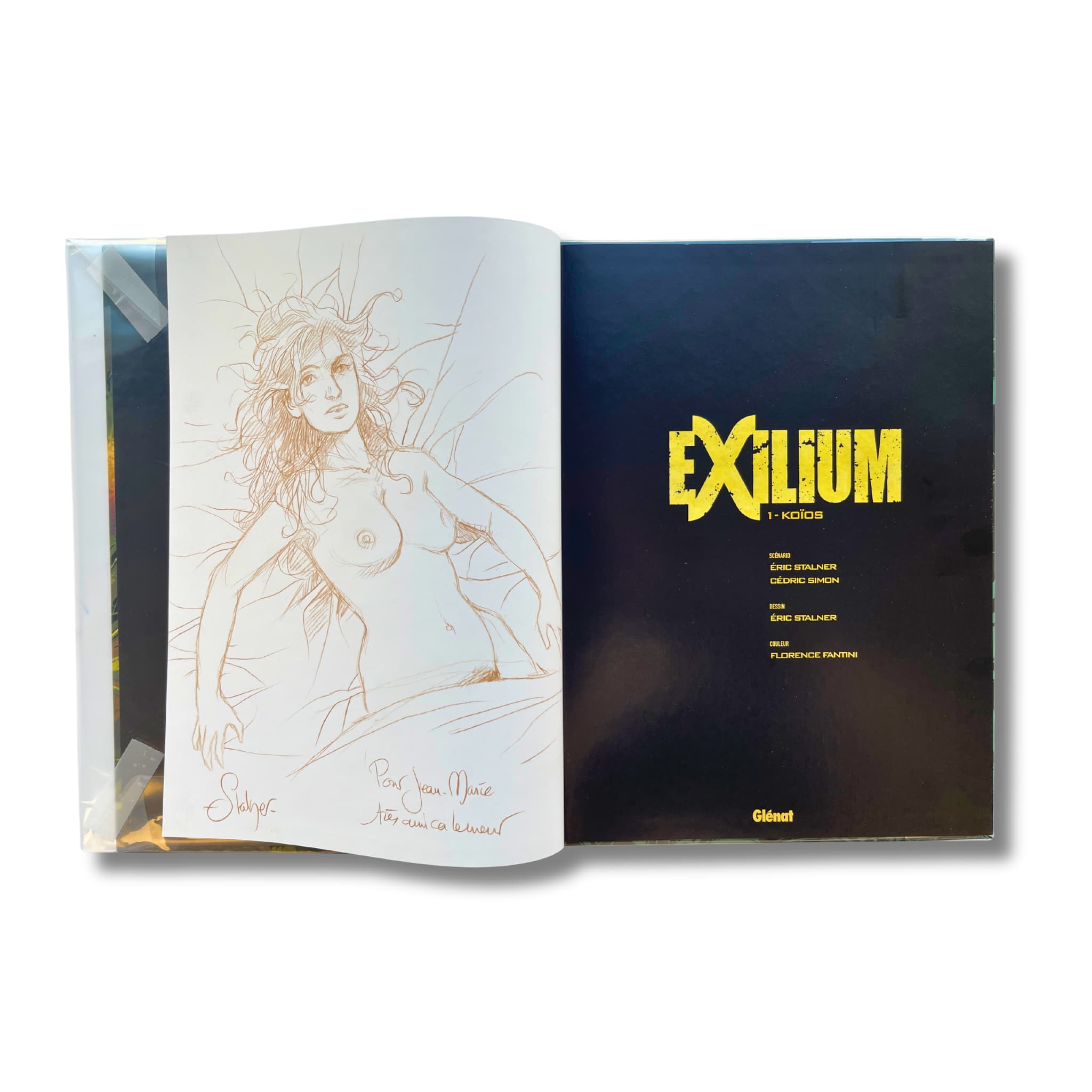 Exilium - 1. Koïos – EO 2018, accompagné d’une dédicace couleur signée par Stalner sur page blanche, avec ex-libris (30 × 21 cm).