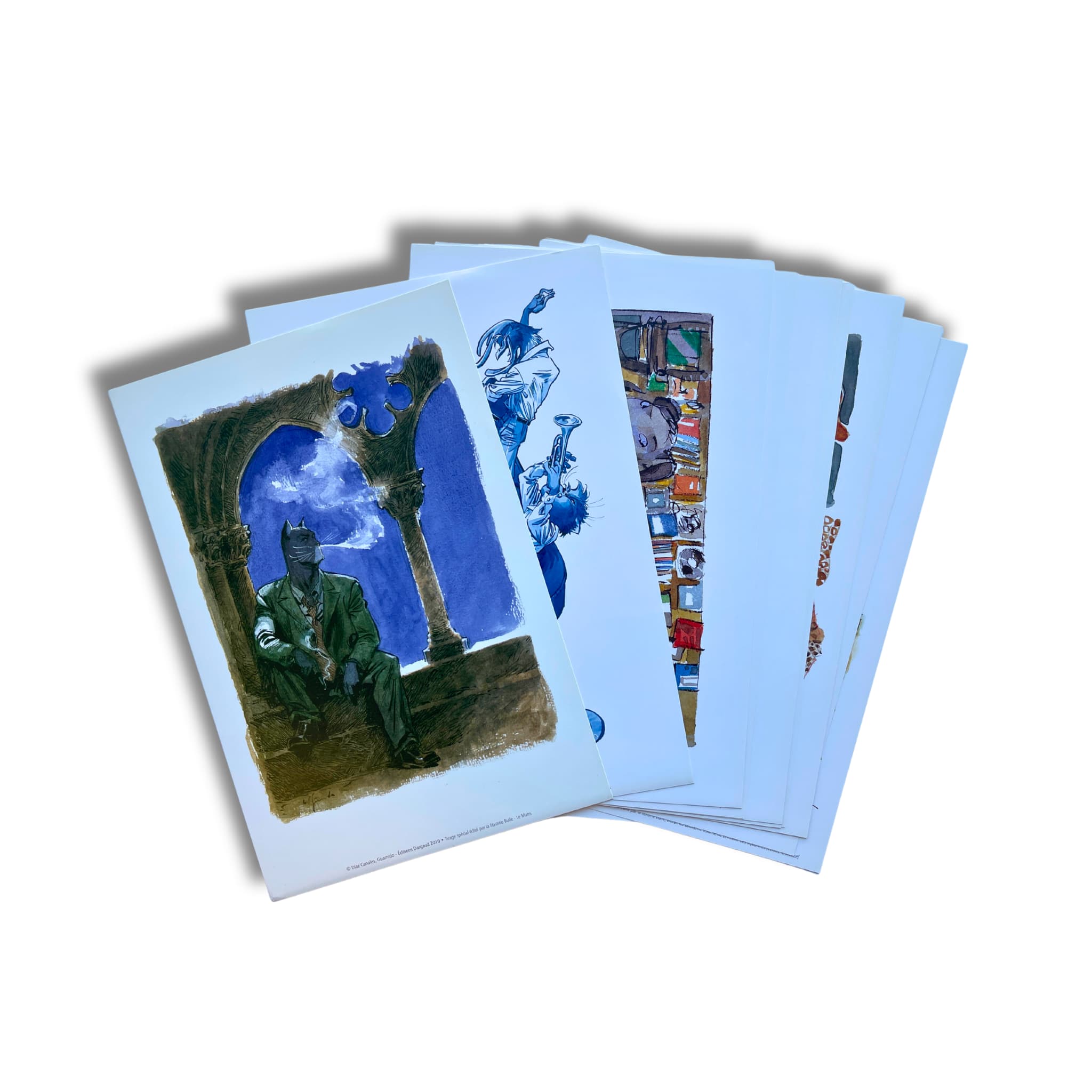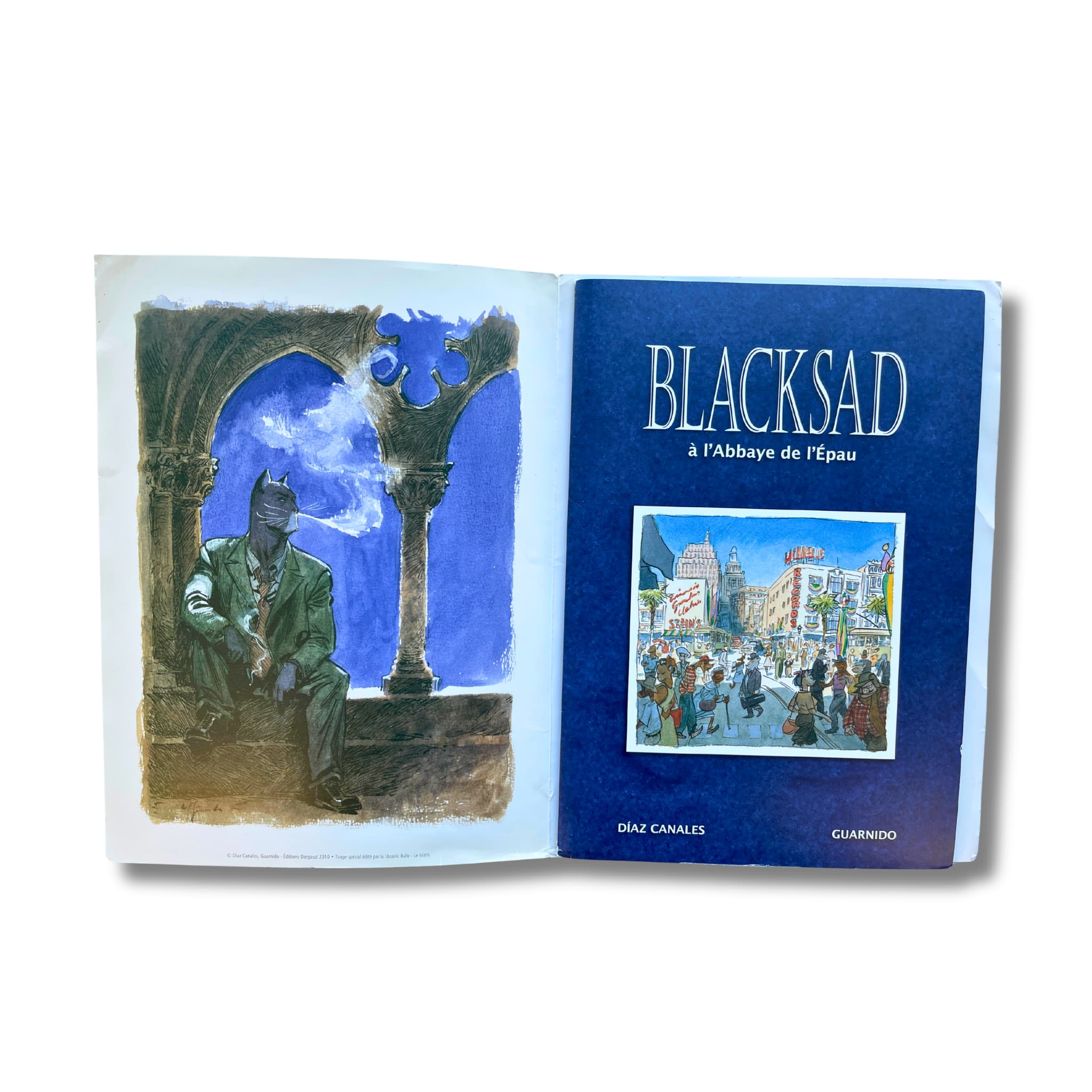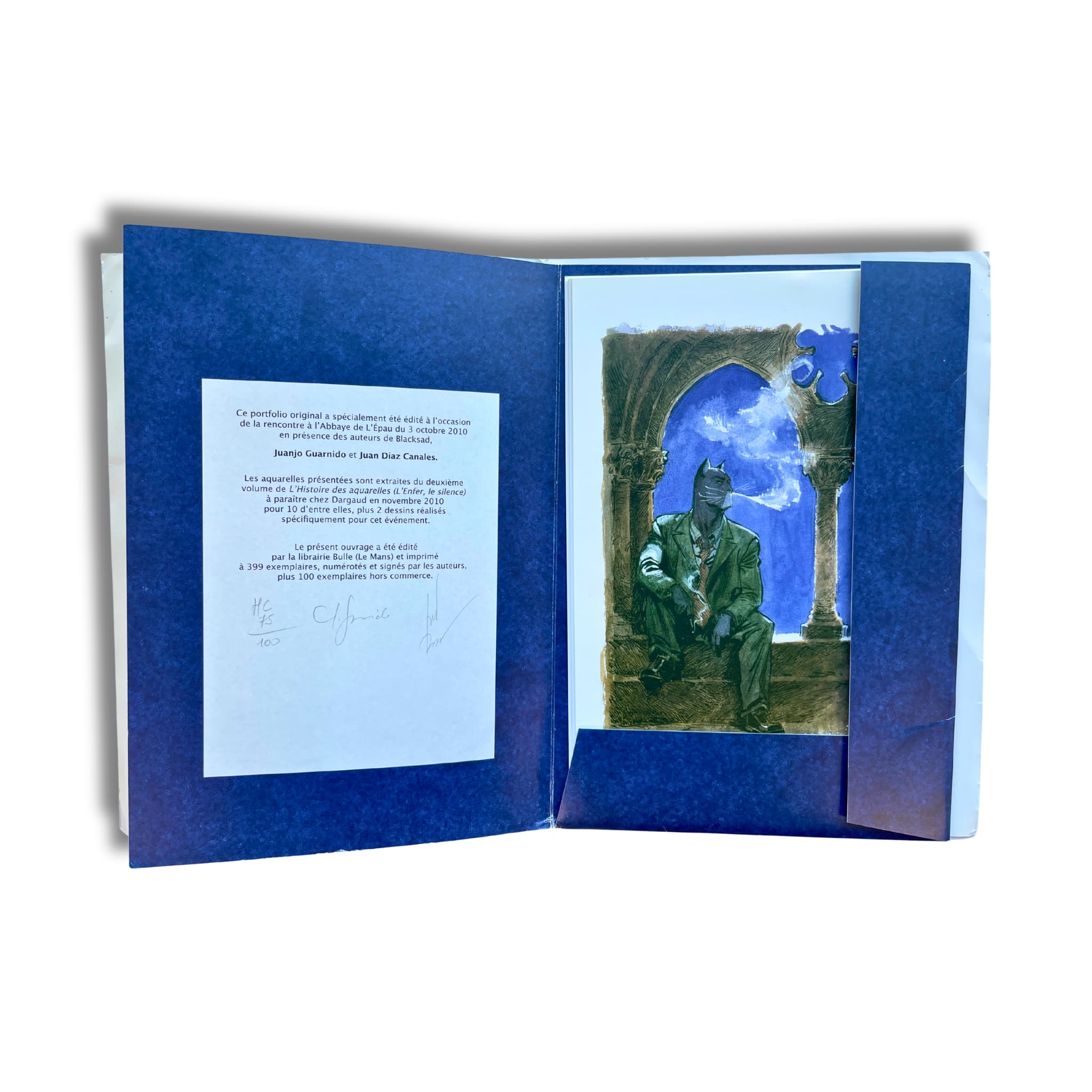 Portfolio Blacksad – à l’abbaye de l’Épau – EO 2010. Ce portfolio original a spécialement été édité à l’occasion de la rencontre à l’abbaye de l’Épau. Le présent ouvrage a été édité par la librairie Bulle (Le Mans) et imprimé à 399 exemplaires, numérotés et signés par les auteurs, ainsi que 100 exemplaires hors commerce.