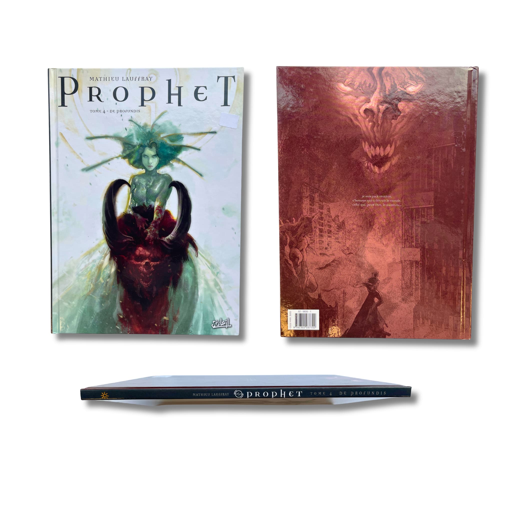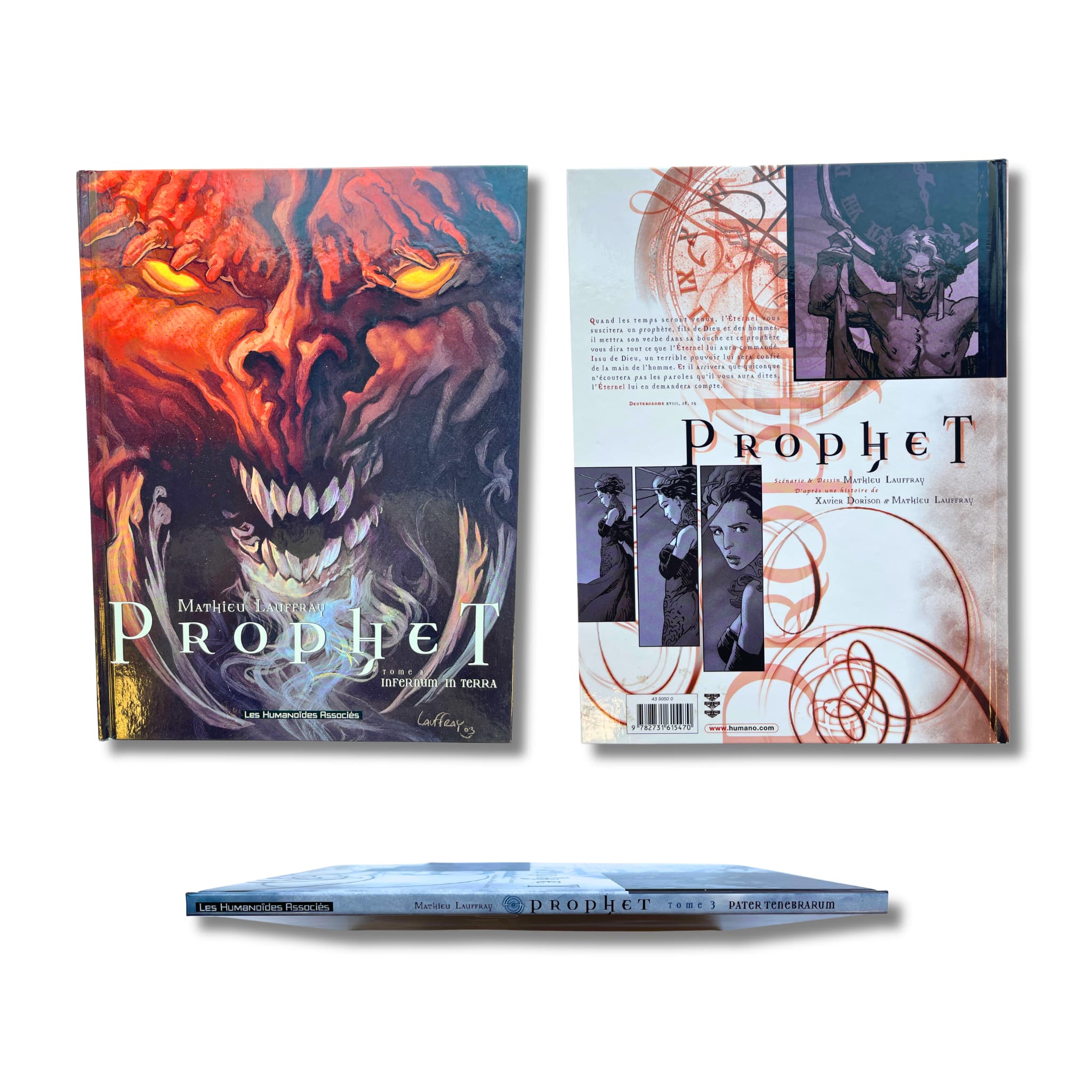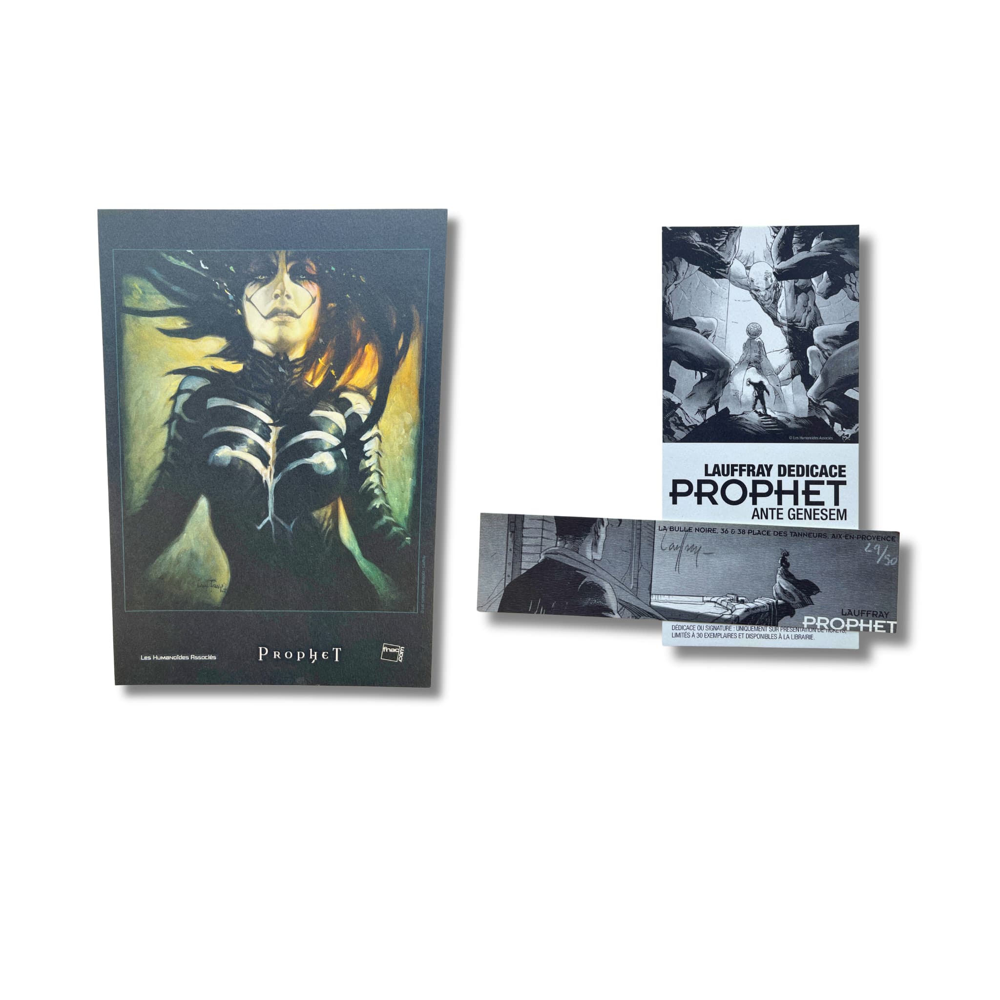Prophet – Intégrale T. 1 à 4 – EO 2000-2014, avec une superbe dédicace originale en couleur, signée par Mathieu Lauffray sur les pages blanches, accompagnée de deux ex-libris : l’un (5 × 21 cm), signé, tirage limité n° 29/50, et l’autre (18 × 26 cm).