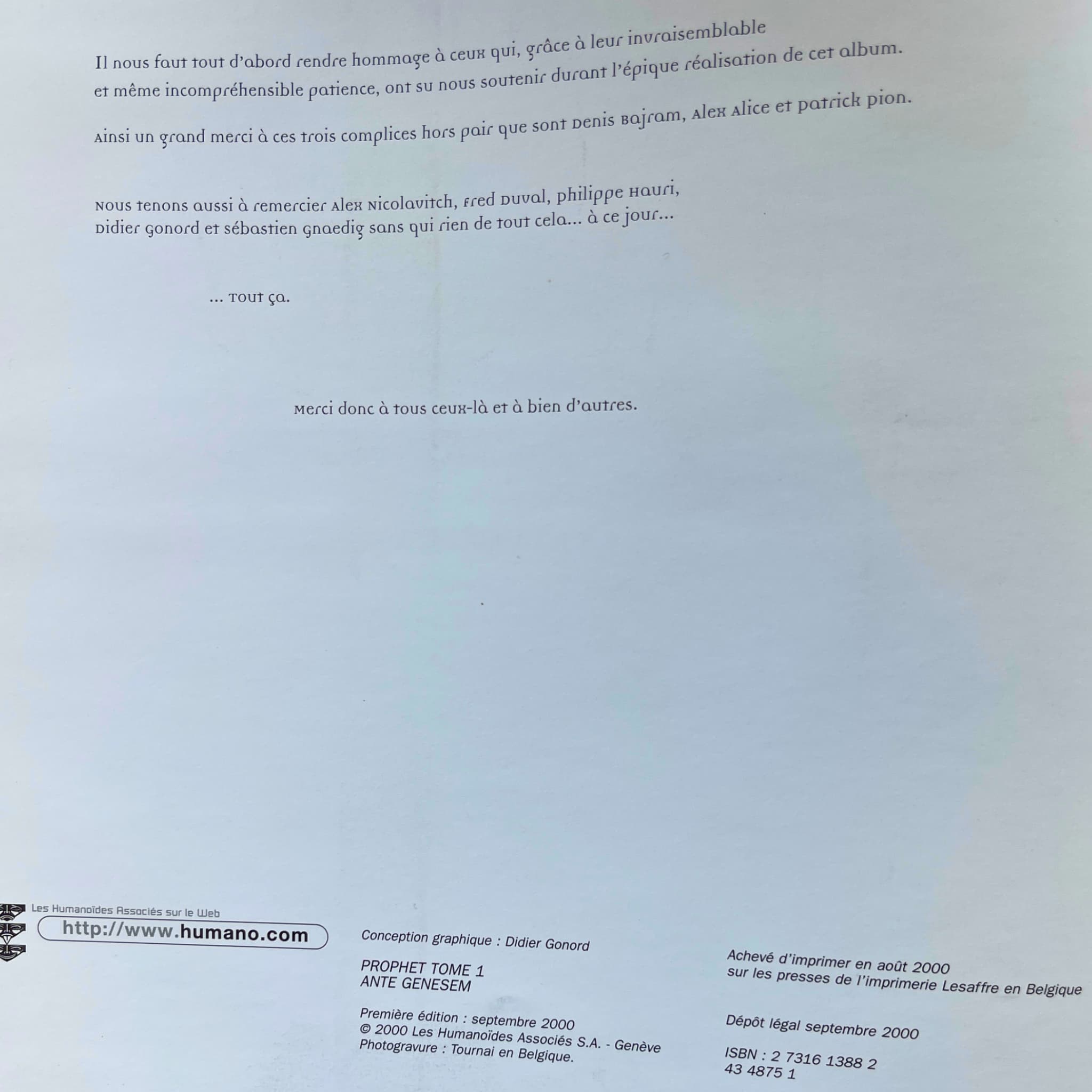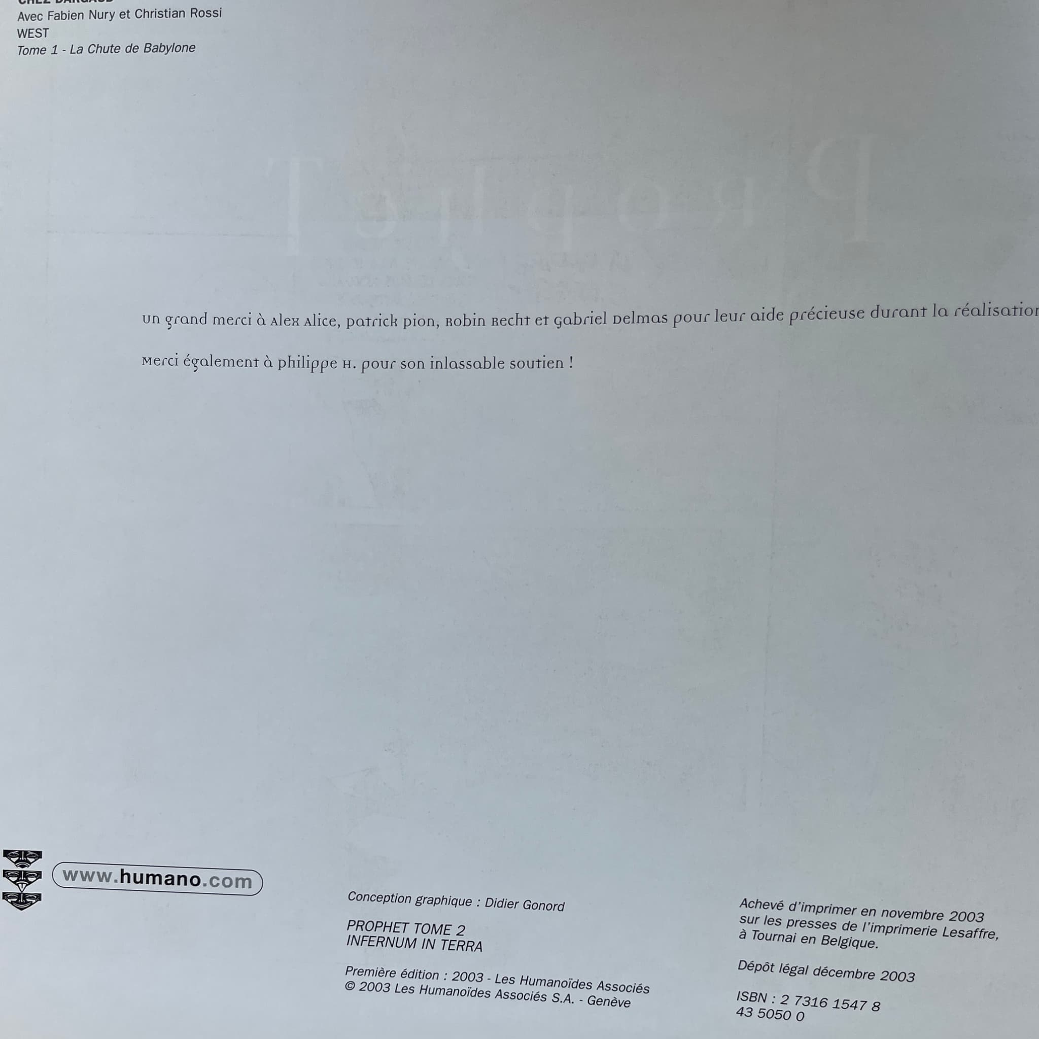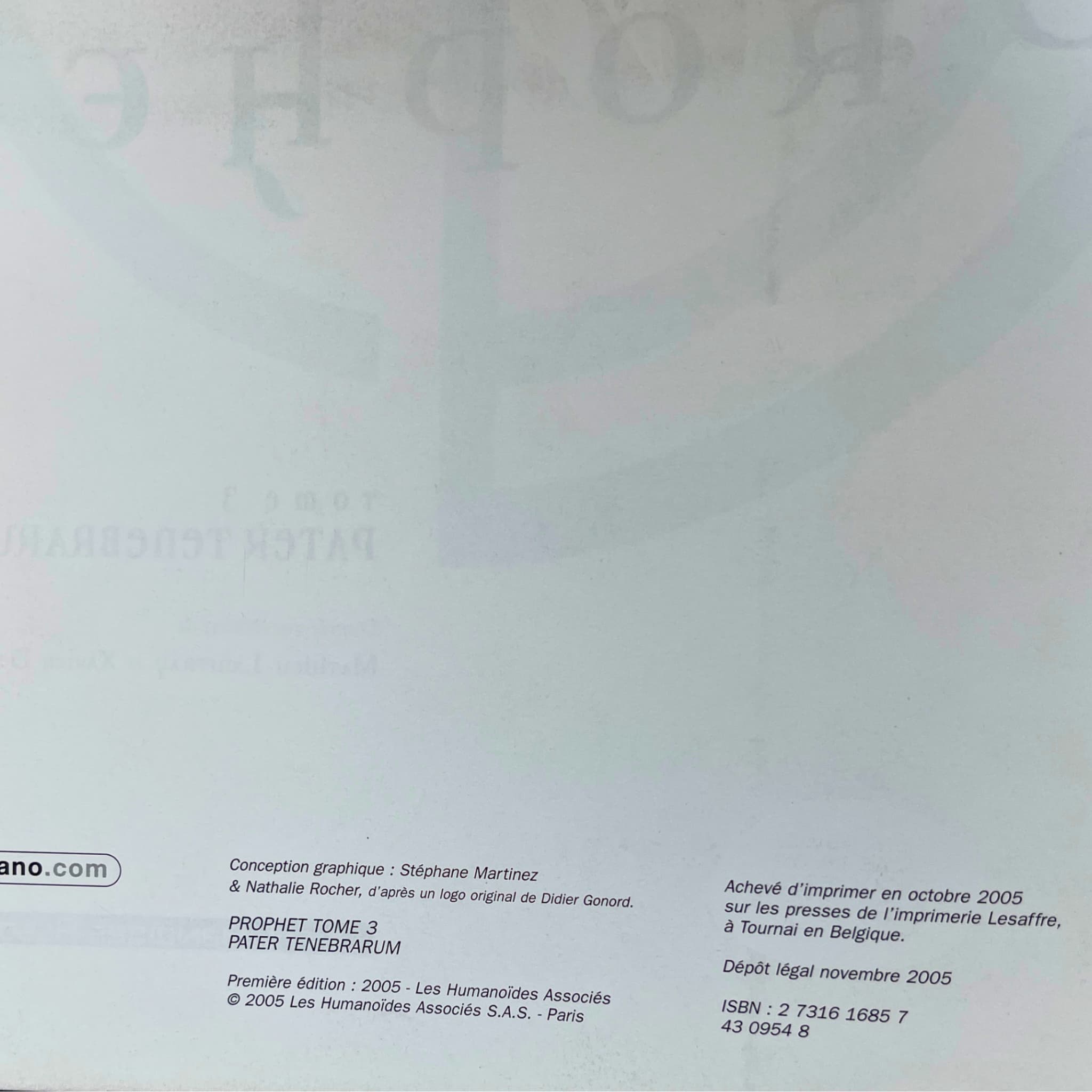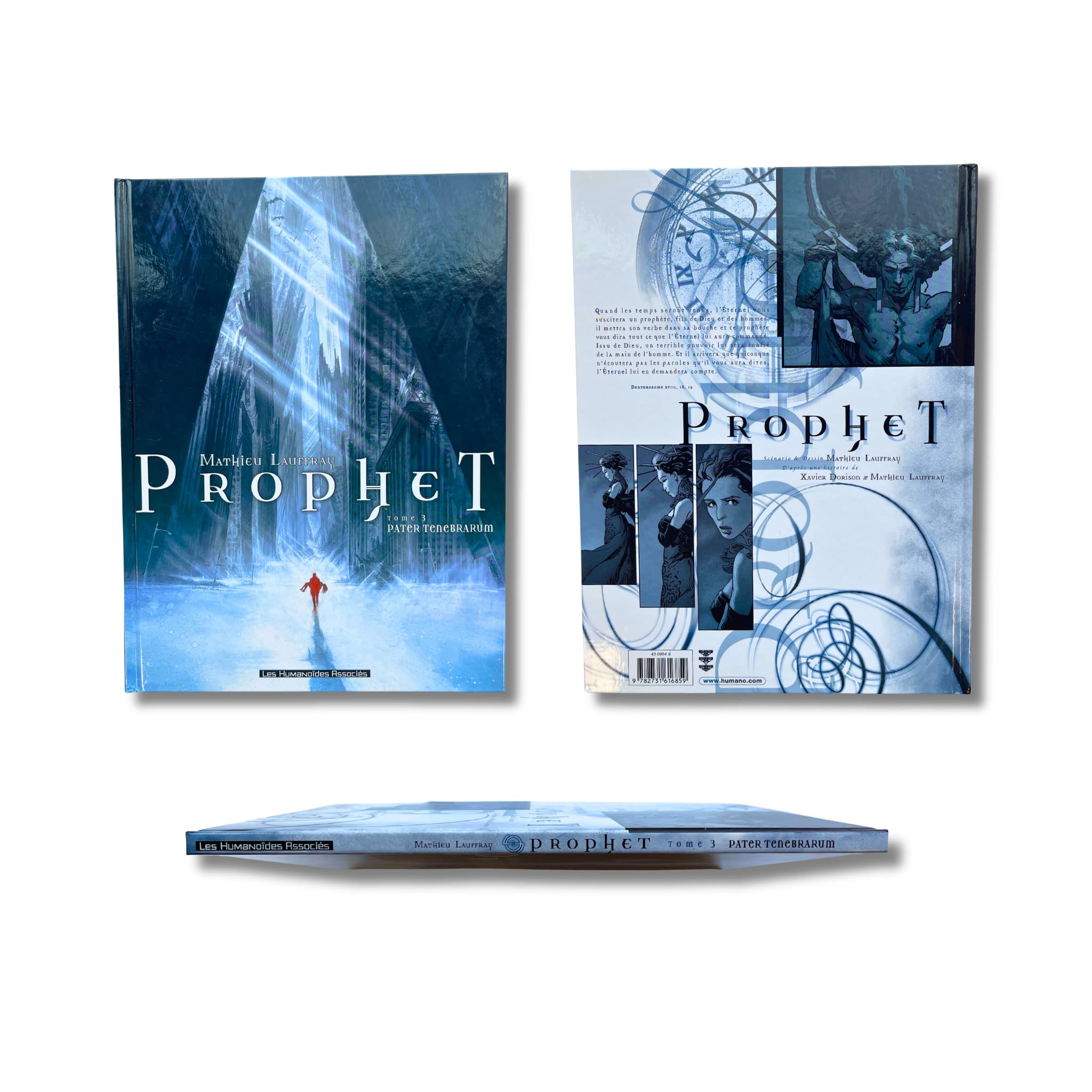 Prophet – Intégrale T. 1 à 4 – EO 2000-2014, avec une superbe dédicace originale en couleur, signée par Mathieu Lauffray sur les pages blanches, accompagnée de deux ex-libris : l’un (5 × 21 cm), signé, tirage limité n° 29/50, et l’autre (18 × 26 cm).