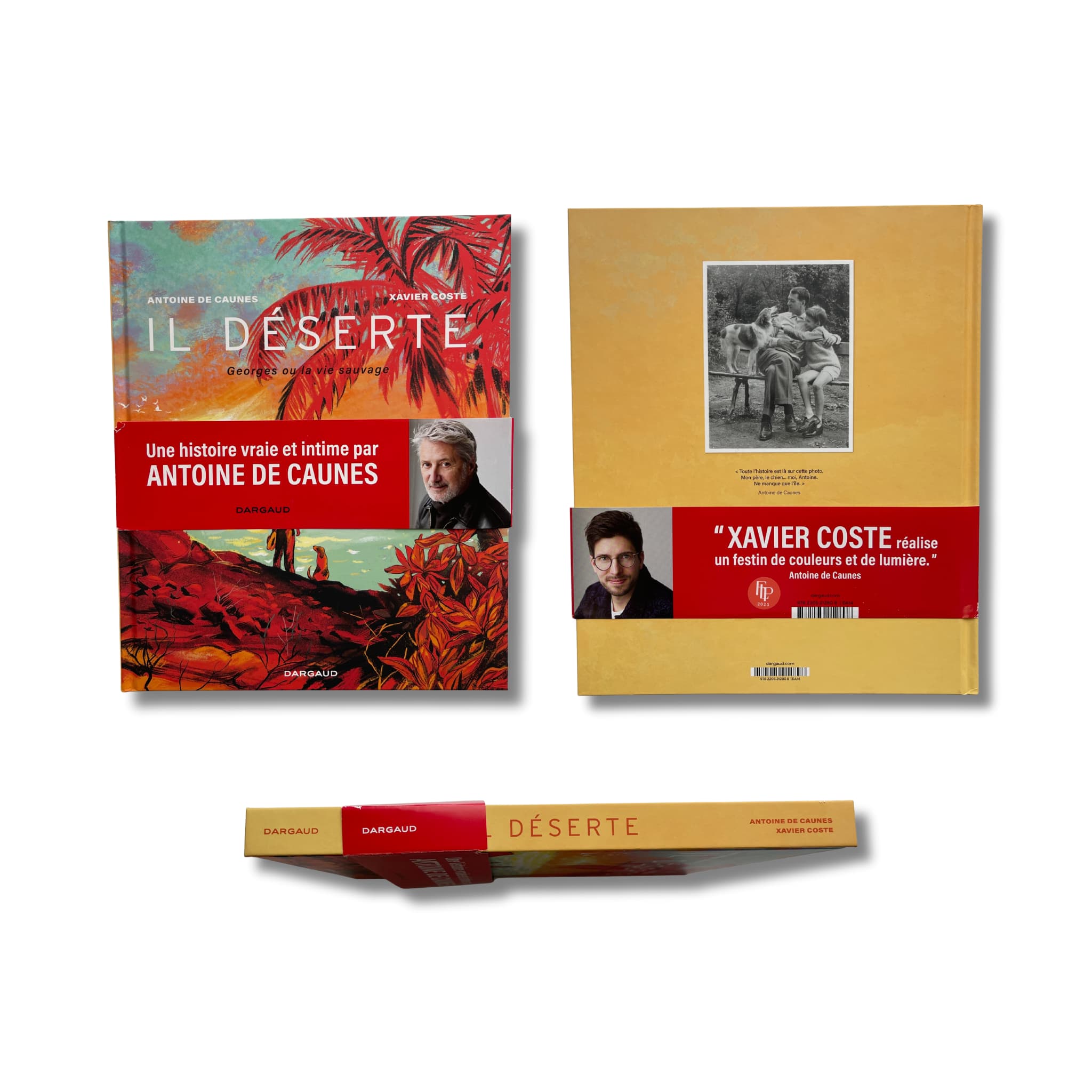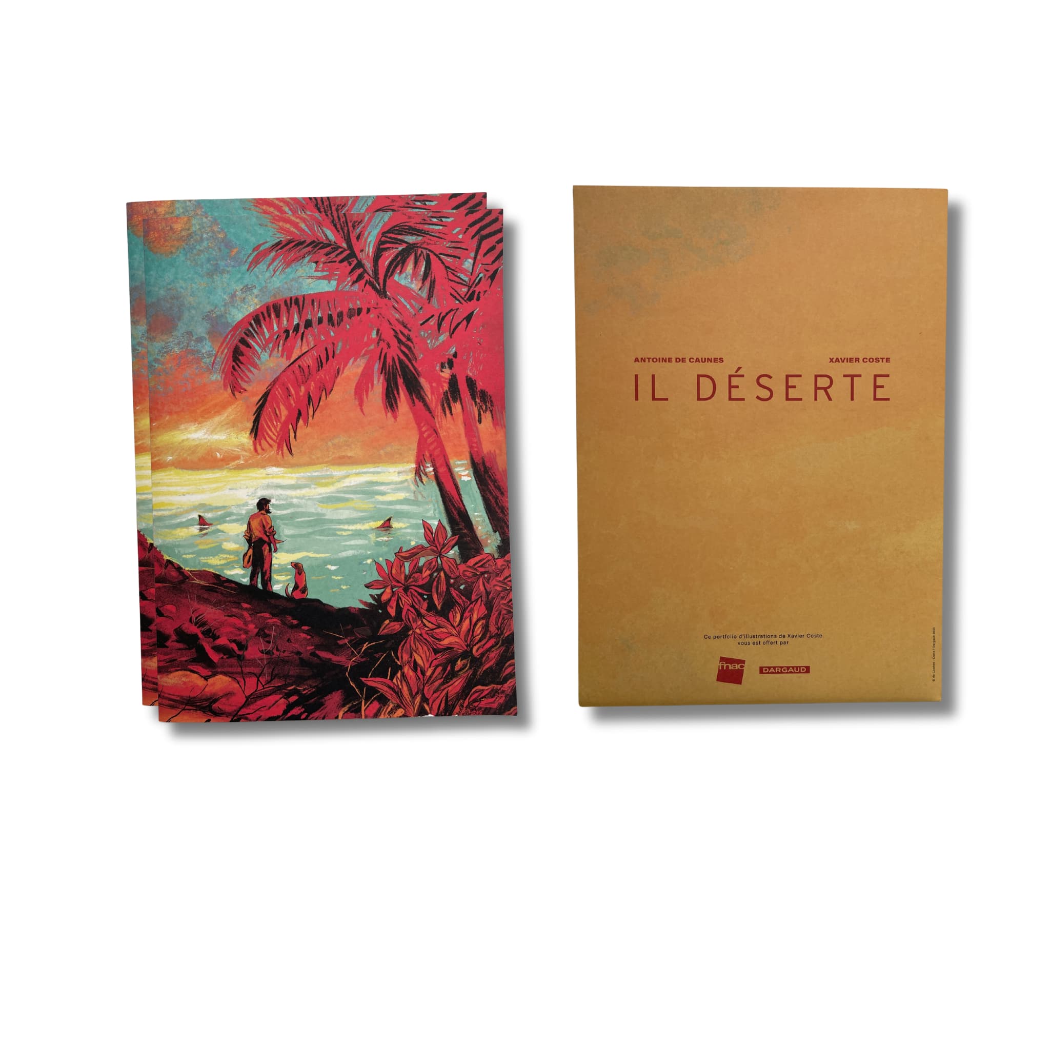 « Il déserte » – Édition originale 2025, accompagnée d’une dédicace de Xavier Coste et d’un manuscrit de De Caunes sur page blanche, ainsi que du portfolio Il déserte de Xavier Coste, comprenant une pochette avec 5 dessins au format A4.