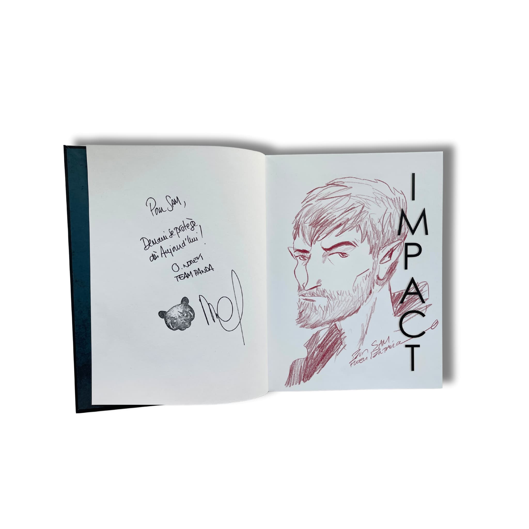 Impact – Green War, édition originale de 2025, accompagnée d’une dédicace signée par Pontarolo, avec texte manuscrit et tampon de Norek, sur deux pages blanches.