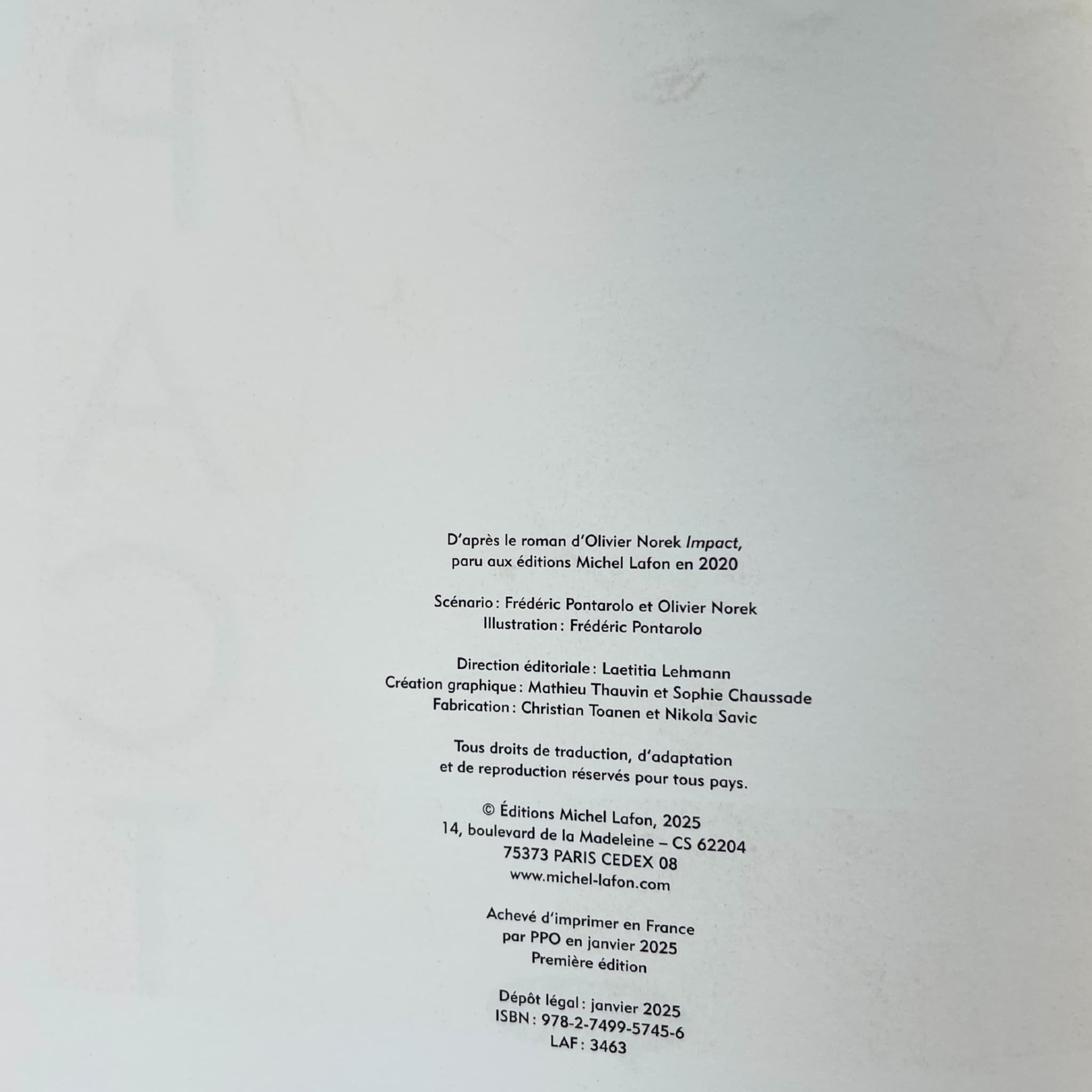 Année : 2025 Auteur : Norek - Pontarolo Éditeur : Michel Lafon – Édition originale Langue : Français