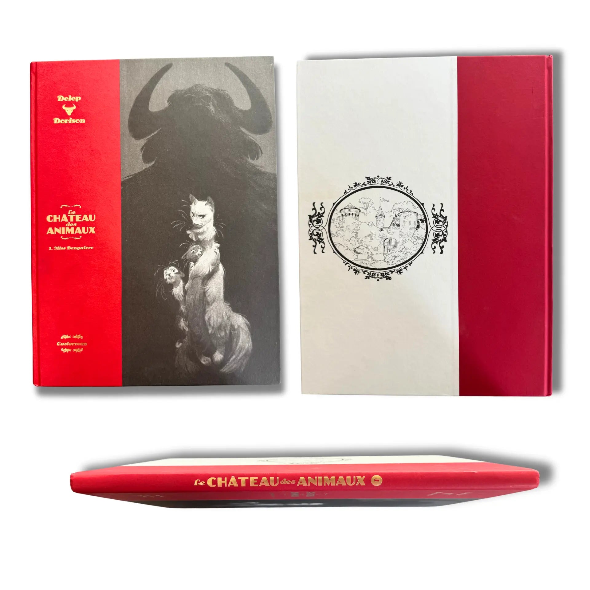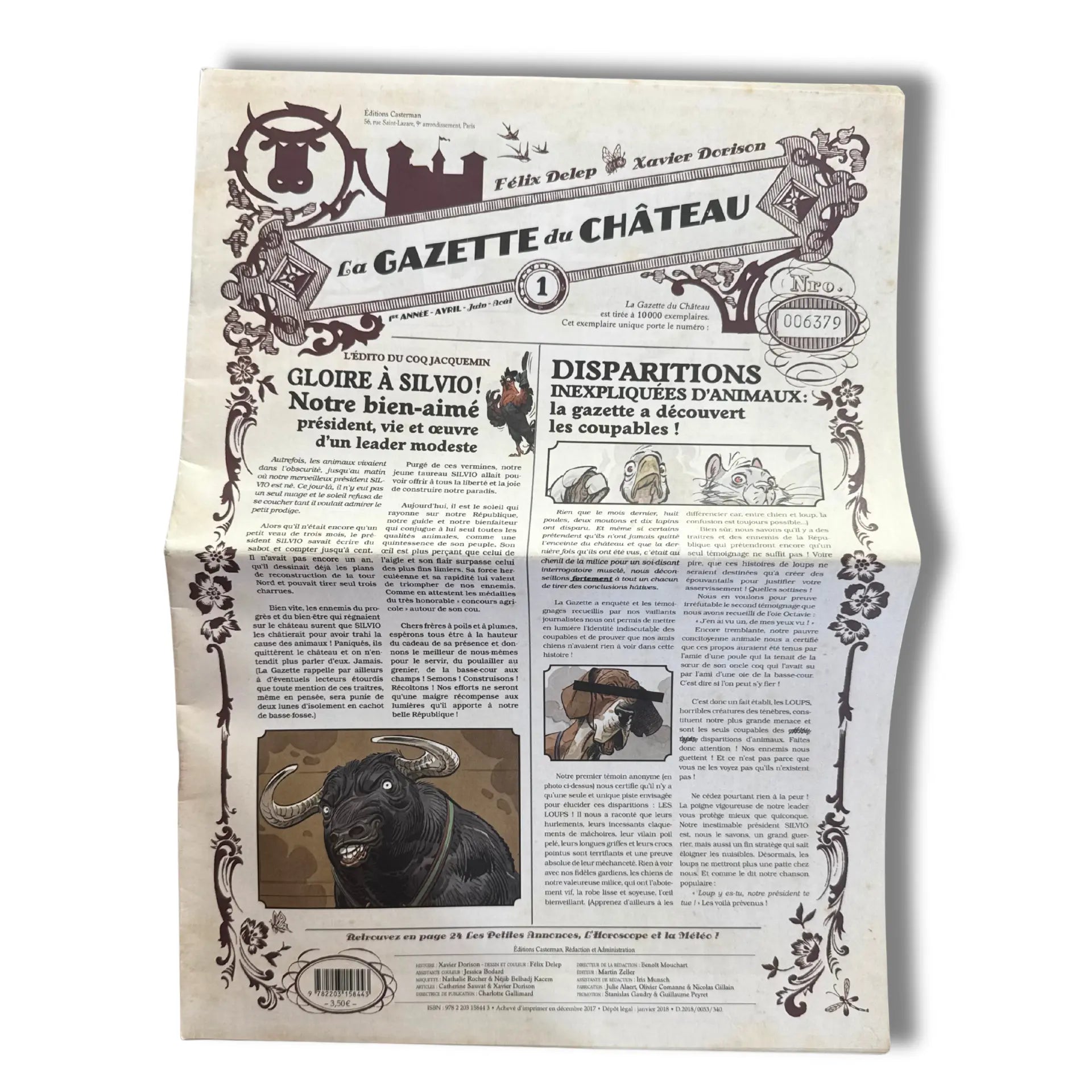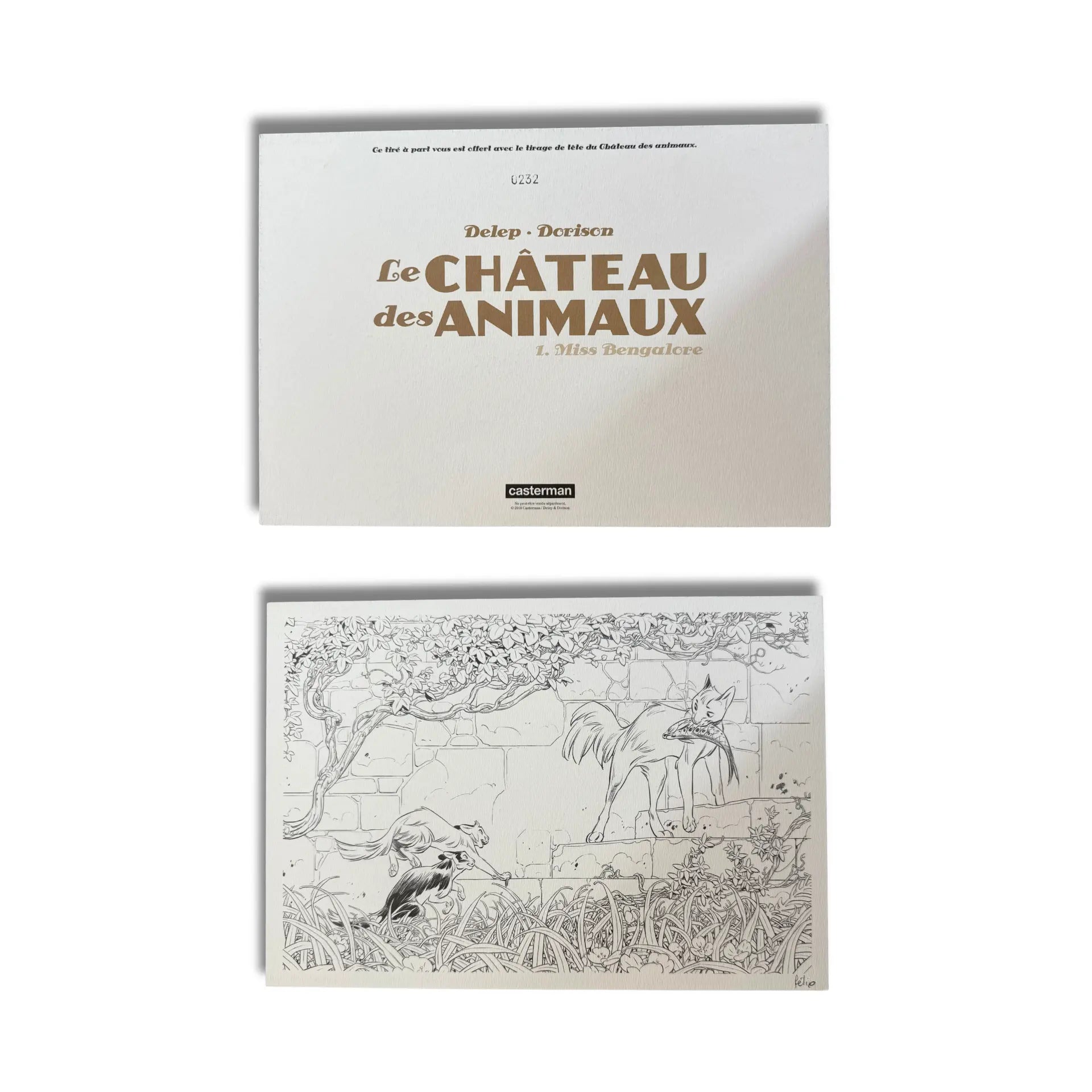 « Le château des Animaux T1 », Tirage limité à 3000, 2019 avec une superbe dédicace de Delep sur le page blanche accompagné d'un Ex libris numéroté Format 373 x 283 mm Avec 8 pages de croquis en fin d'album. + La Gazette du Château ; Le Château des Animaux No .1, est un exemplaire rare et très recherché aujourd’hui.